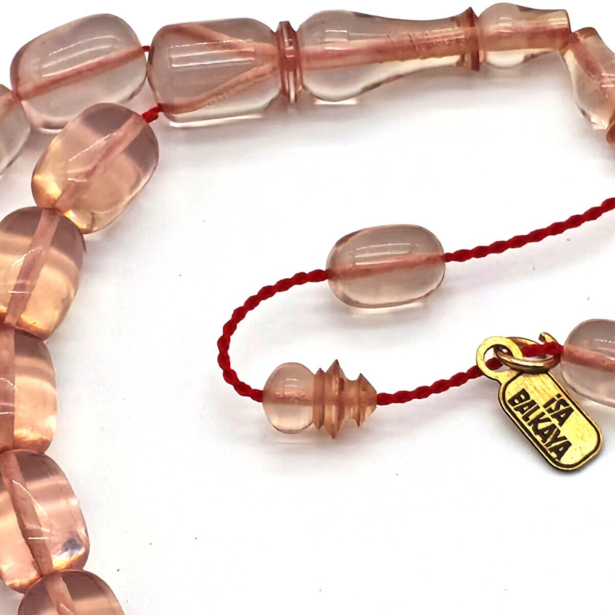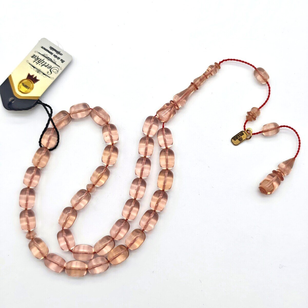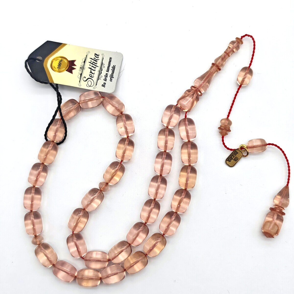 Tesbihlerde kullanılan materyal, ürün başlığında belirtilen cins bilgisine göre (sıkma kehribar, ateş kehribar vb.) değişmektedir. Kehribar yapısı gereği renk ve desenlerde doğal farklılıklar görülebilir.