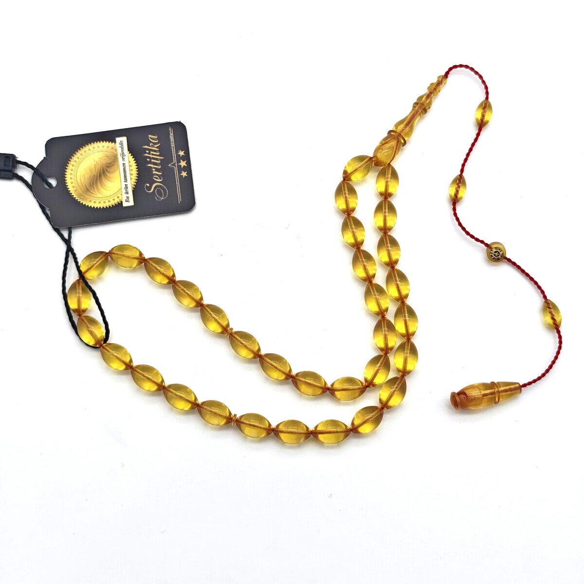 Tesbihlerde kullanılan materyal, ürün başlığında belirtilen cins bilgisine göre (sıkma kehribar, ateş kehribar vb.) değişmektedir. Kehribar yapısı gereği renk ve desenlerde doğal farklılıklar görülebilir.