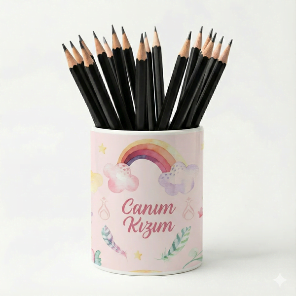 Eğlenceli Seramik Kalemlik - Çiçek Bahçesi ve Gökkuşağı Temalı Pembe - Canım Kızım - Çizgi M20