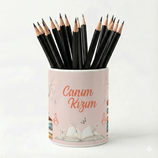 Eğlenceli Seramik Kalemlik - Çiçekli ve Kitap Temalı Pembe - Canım Kızım - Çizgi M27