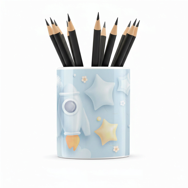 Eğlenceli Seramik Kalemlik - Uçan Balon ve Uzay Macerası Temalı Mavi - Çizgi M11