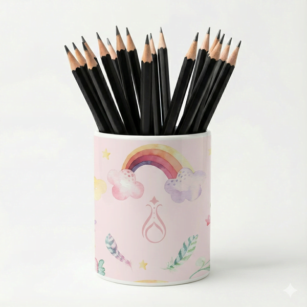 Eğlenceli Seramik Kalemlik - Çiçek Bahçesi ve Gökkuşağı Temalı Pembe - Canım Kızım - Çizgi M19