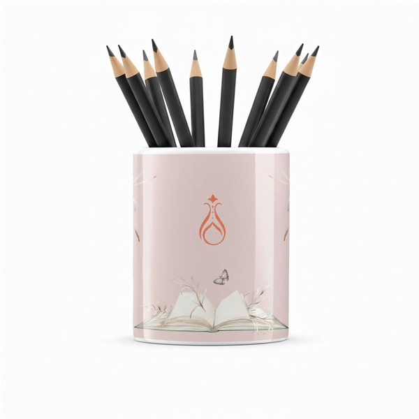 Eğlenceli Seramik Kalemlik - Çiçekli ve Kitap Temalı Pembe - Çizgi M28