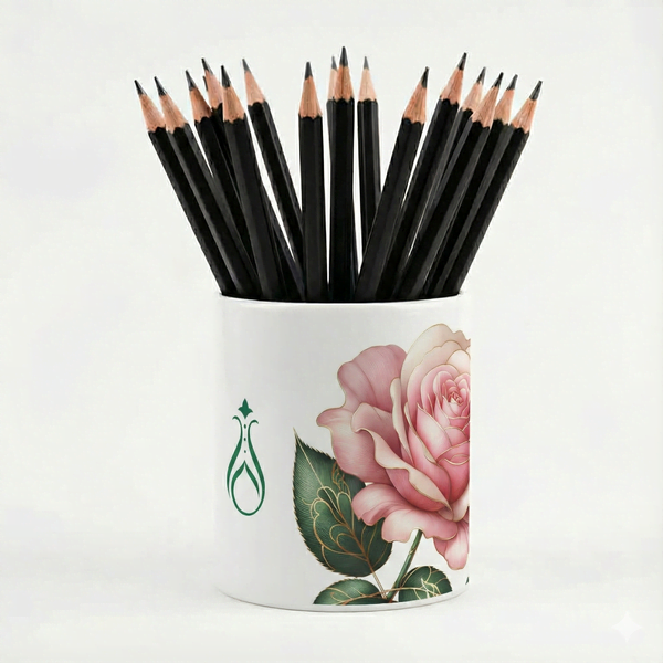 Yapraklı Gül Desenli Pembe Seramik Kalemlik - İlk Günkü Aşkla - Serhendi Logolu - Çizgi M5