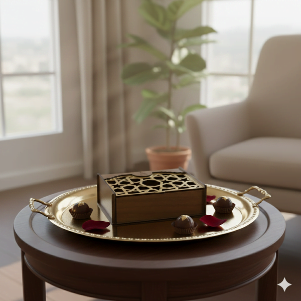 Zarif açık desenli kapağı ve altın pleksi detaylarıyla dikkat çeken bu küçük boy MDF kutu, ceviz rengin sıcaklığıyla sunumlarınıza estetik bir dokunuş katar.
