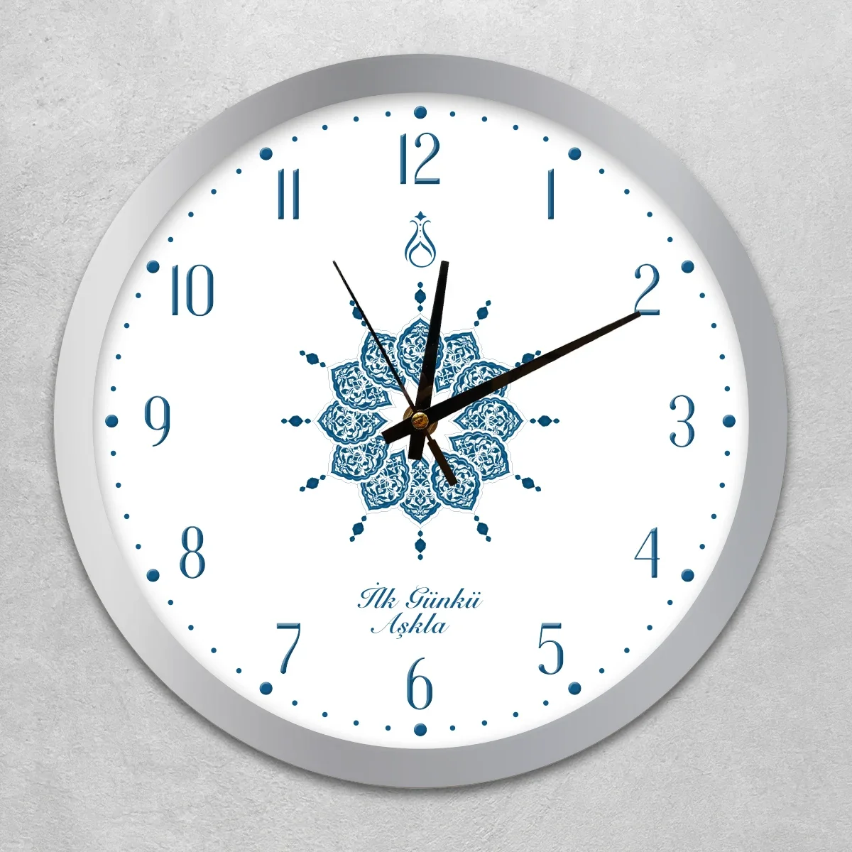 Duvar Saati 35 cm Çap Cam, Akar Saniyeli, Sessiz Mekanizma - Serhendi Logolu - İlk Günkü Aşkla - Çini Desen Gümüş Çerçeve M2