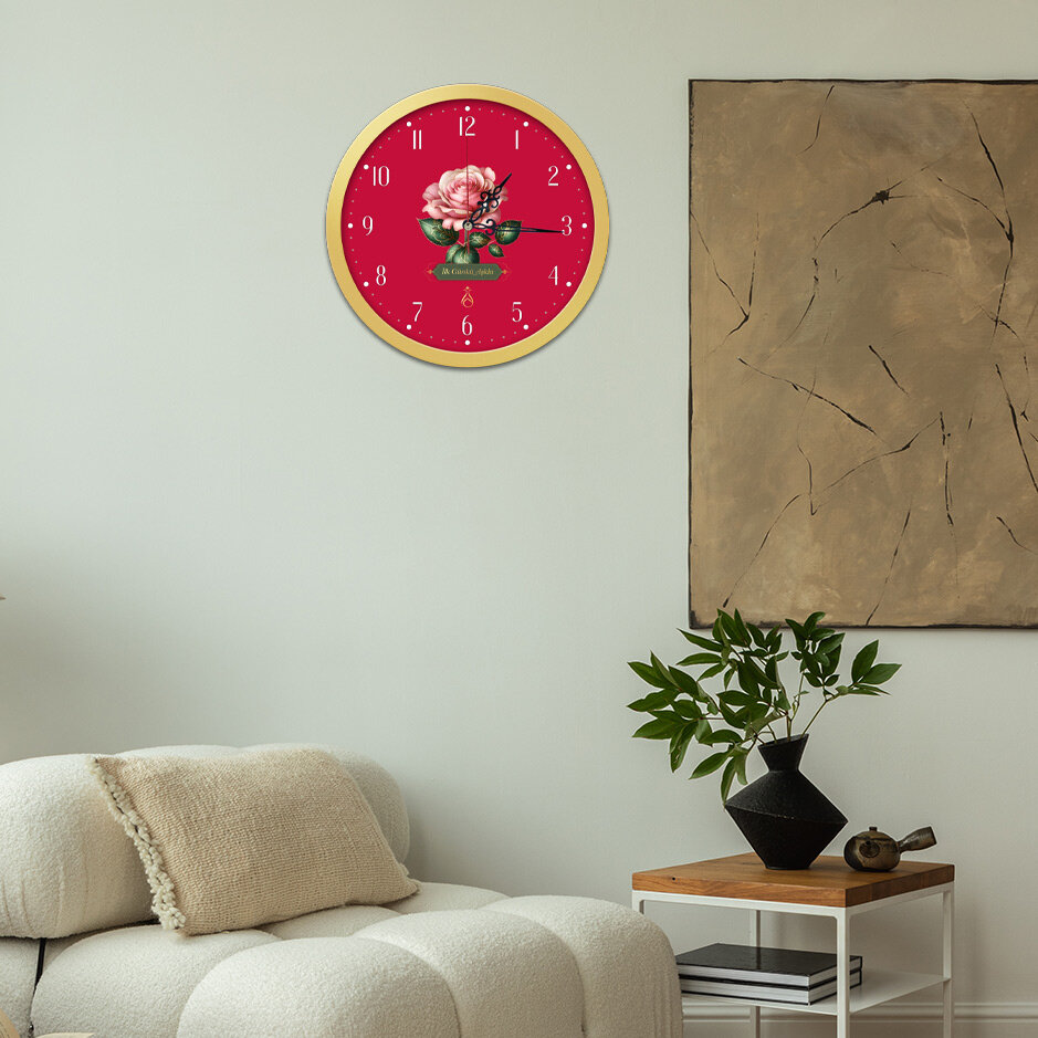 Duvar Saati 30 cm Cam, Akar Saniyeli, Sessiz Mekanizma - Serhendi Logolu - İlk Günkü Aşkla - Pembe Gül Altın Çerçeve M1