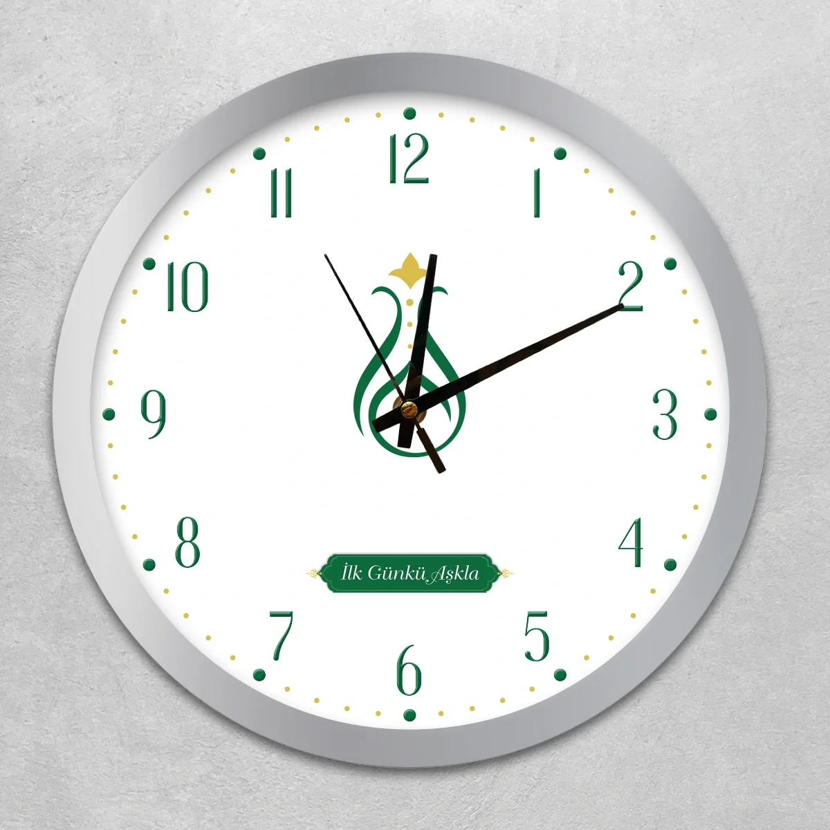 Duvar Saati 35 cm Çap Cam, Akar Saniyeli, Sessiz Mekanizma - Serhendi Logolu - İlk Günkü Aşkla - Sade Desen Gümüş Çerçeve M5