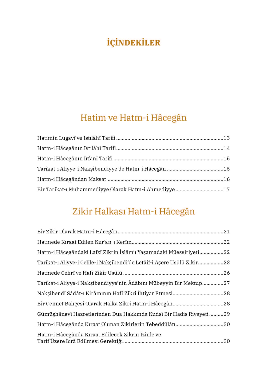 Nakşibendiyye tarikatının esaslarından biri hatm-i hacegândır. Sâdât-ı kirâmın üzerinde çokça durduğu bu esas, nefsin ıslahı ve istikamet için cemaatin önemini gözeten bir ameldir. Dinimizde zikre verilen değer ve Hz. Peygamber’in zikir meclislerini ayrıca methi düşünüldüğünde bu kıymetli amelin ehemmiyeti ortaya çıkmaktadır. Hatm-i hacegânın mahiyeti, önemi ve delilleri yanında Nakşibendiyye sâdâtı silsilesinin sunulduğu eser, üslup olarak ilim ehline hitap eden bir “prestij kitabı” olma hüviyeti taşıyor.