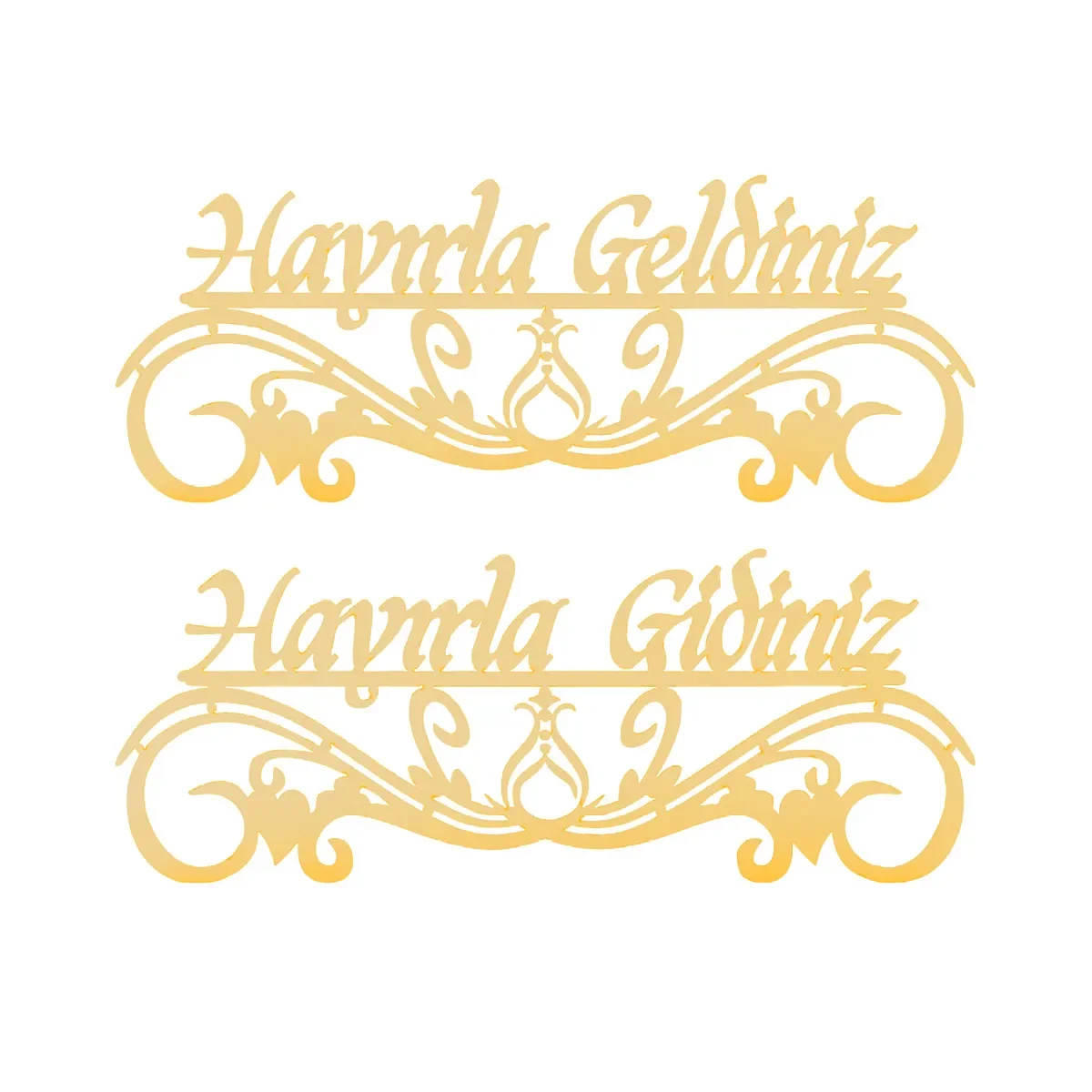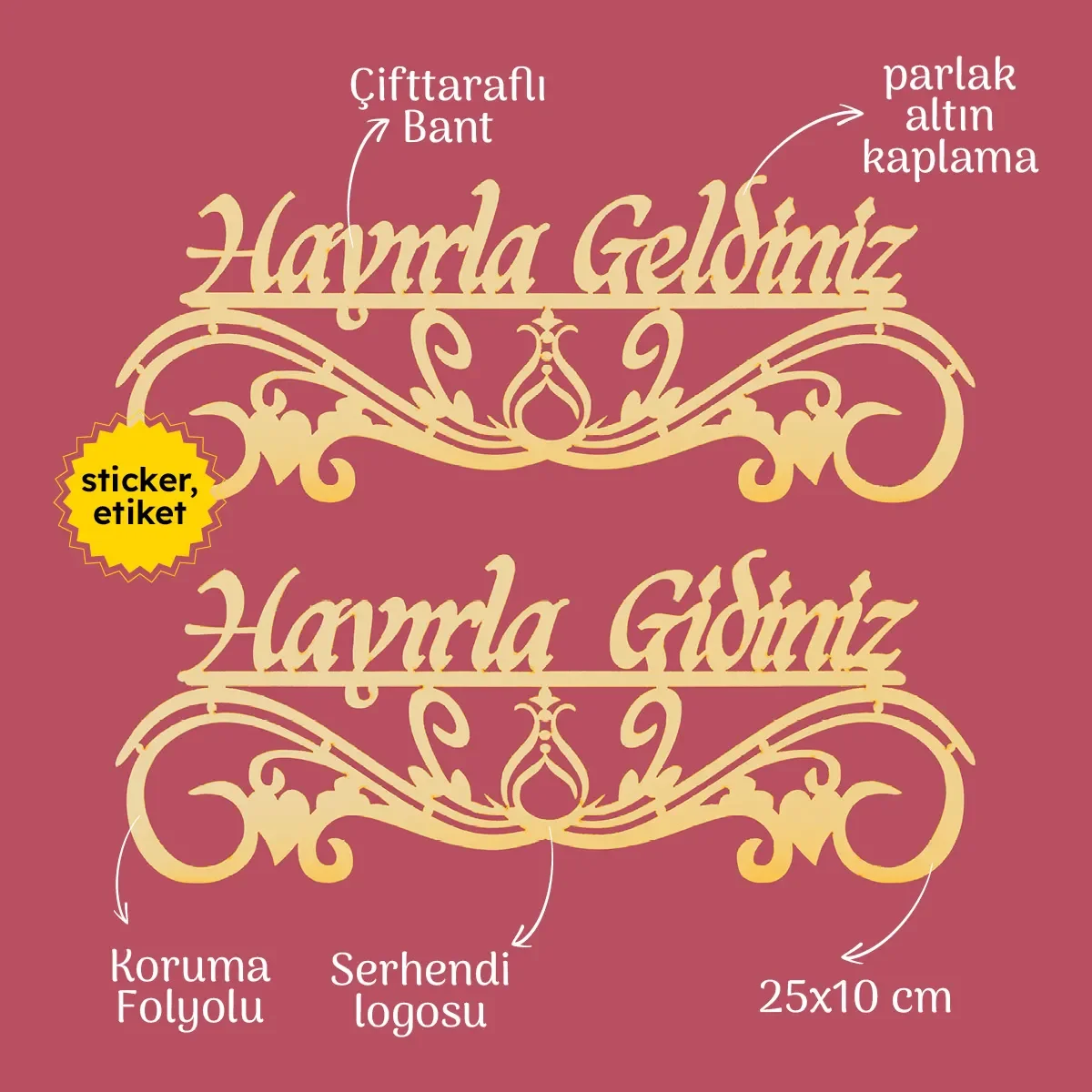Hayırla Geldiniz ve Hayırla Gidiniz Kapı Süsü - 25x10 Serhendi Logolu, Altın Pleksi Sticker Etiket M11