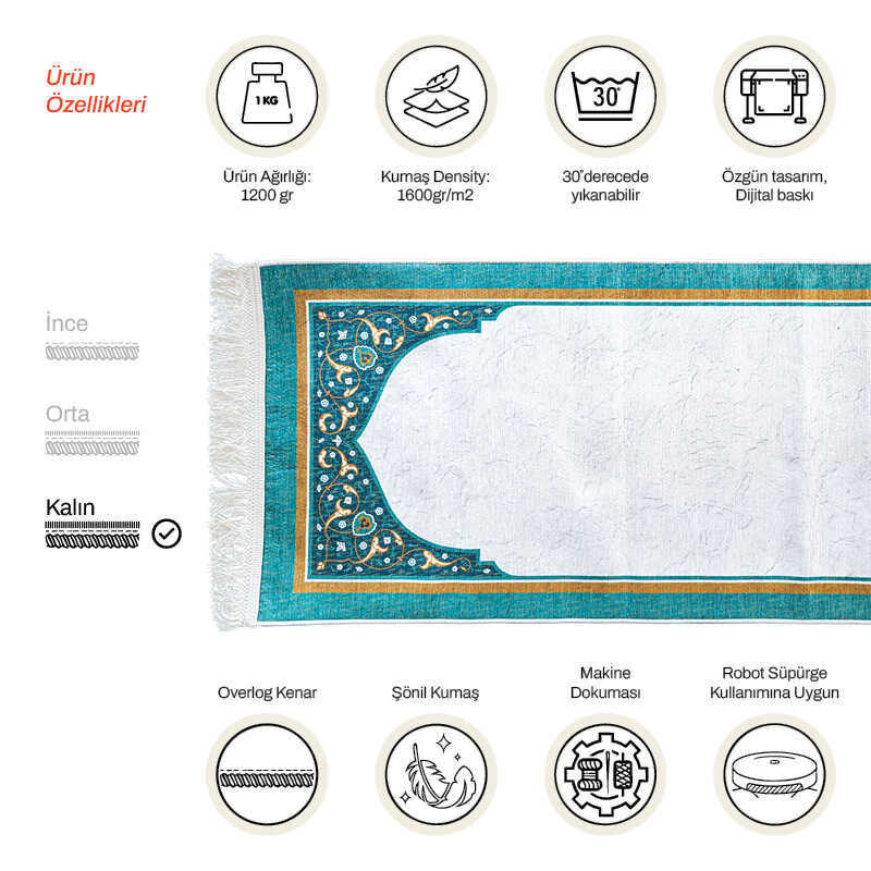 Günlük kullanım için ideal kalınlığa sahip bu şönil kumaş seccade, dijital baskı tekniğiyle hazırlanmış özgün deseniyle dikkat çekiyor. Hem dayanıklı yapısı hem de yumuşak dokusuyla konfor sunan ürün, 30 derecede yıkanabilir oluşuyla da pratiklik sağlıyor. Robot süpürge kullanımına uygun yapısı sayesinde yer serili olduğunda da kolaylıkla temizlenebilir.