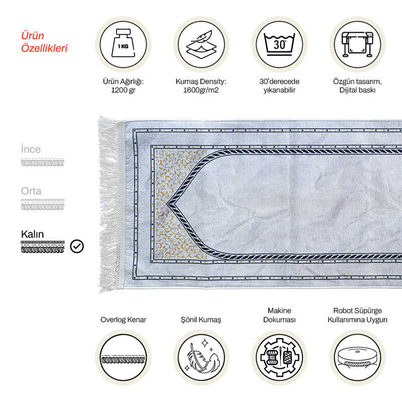 Günlük kullanım için ideal kalınlığa sahip bu şönil kumaş seccade, dijital baskı tekniğiyle hazırlanmış özgün deseniyle dikkat çekiyor. Hem dayanıklı yapısı hem de yumuşak dokusuyla konfor sunan ürün, 30 derecede yıkanabilir oluşuyla da pratiklik sağlıyor. Robot süpürge kullanımına uygun yapısı sayesinde yer serili olduğunda da kolaylıkla temizlenebilir.