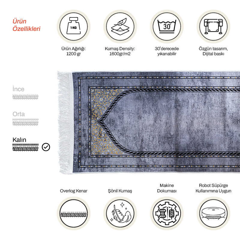 Günlük kullanım için ideal kalınlığa sahip bu şönil kumaş seccade, dijital baskı tekniğiyle hazırlanmış özgün deseniyle dikkat çekiyor. Hem dayanıklı yapısı hem de yumuşak dokusuyla konfor sunan ürün, 30 derecede yıkanabilir oluşuyla da pratiklik sağlıyor. Robot süpürge kullanımına uygun yapısı sayesinde yer serili olduğunda da kolaylıkla temizlenebilir.