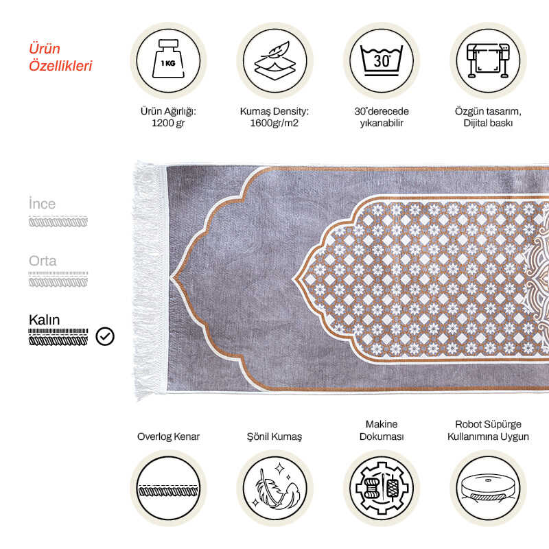 Günlük kullanım için ideal kalınlığa sahip bu şönil kumaş seccade, dijital baskı tekniğiyle hazırlanmış özgün deseniyle dikkat çekiyor. Hem dayanıklı yapısı hem de yumuşak dokusuyla konfor sunan ürün, 30 derecede yıkanabilir oluşuyla da pratiklik sağlıyor. Robot süpürge kullanımına uygun yapısı sayesinde yer serili olduğunda da kolaylıkla temizlenebilir.