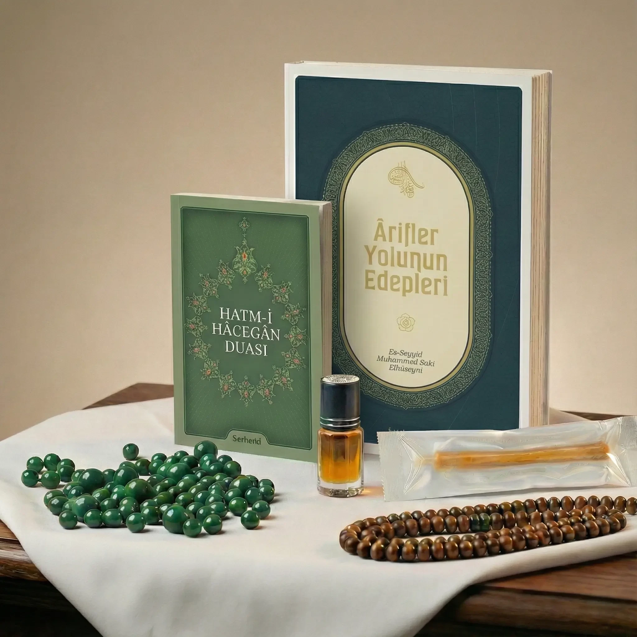 Küçük Boy Yeşil Hatme Taşı, Vird Örtüsü, Vird Tesbihi, Golden Misvak, Miski Amber Esansı 3ml, Küçük Hatme Duası Kitabı, Arifler Yolunun Edepleri Kitabı