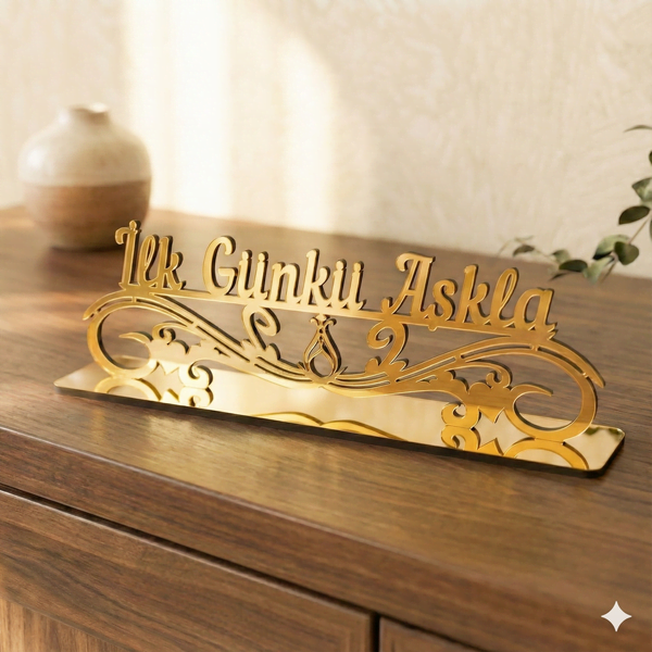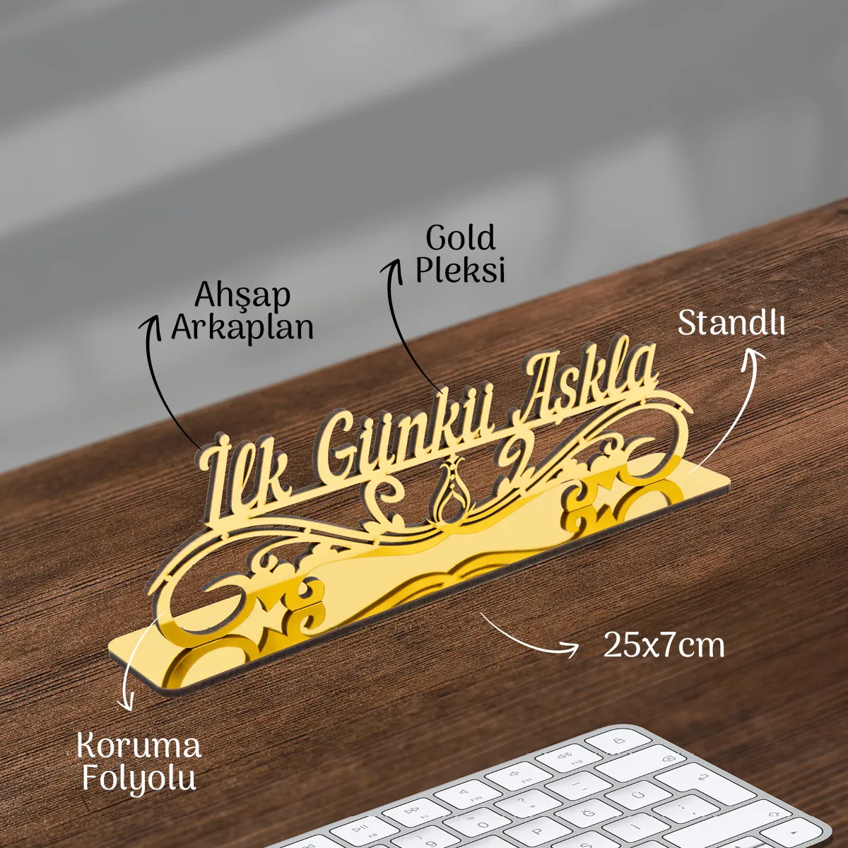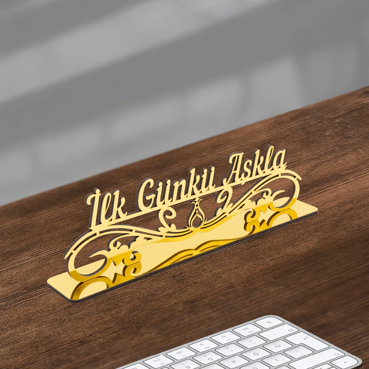 “İlk Günkü Aşkla” yazılı bu masaüstü dekor, hem evde hem de ofis ortamında anlamlı bir detay olarak tercih edilebilir.