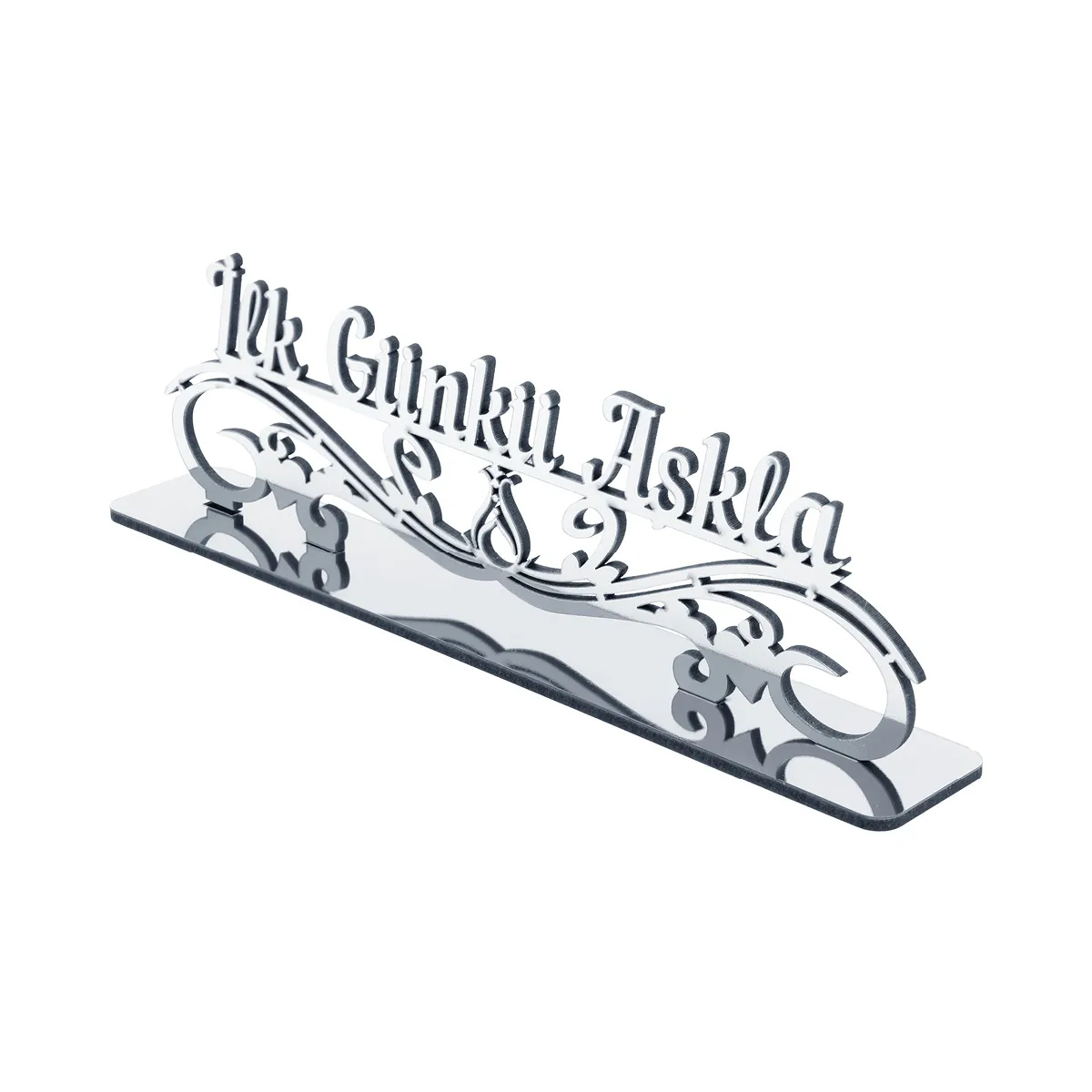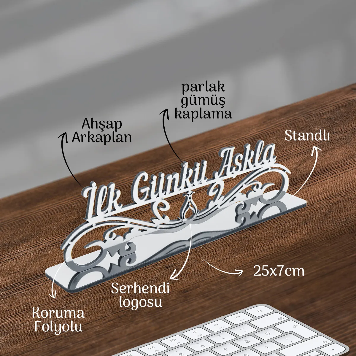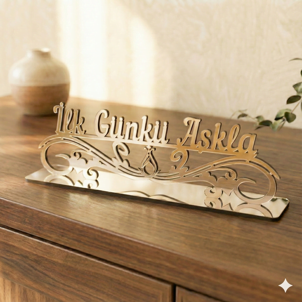 MDF destekli masaüstü dekor, pleksi üst yüzeyiyle hem ev hem ofis ortamına uygundur. Üzerinde “İlk Günkü Aşkla” yazısı ve Serhendi logosu bulunur. Gümüş ve altın renk seçenekleriyle sunulur. Pleksi üzerindeki koruyucu jelatin, kullanım öncesi çıkarılmalıdır.