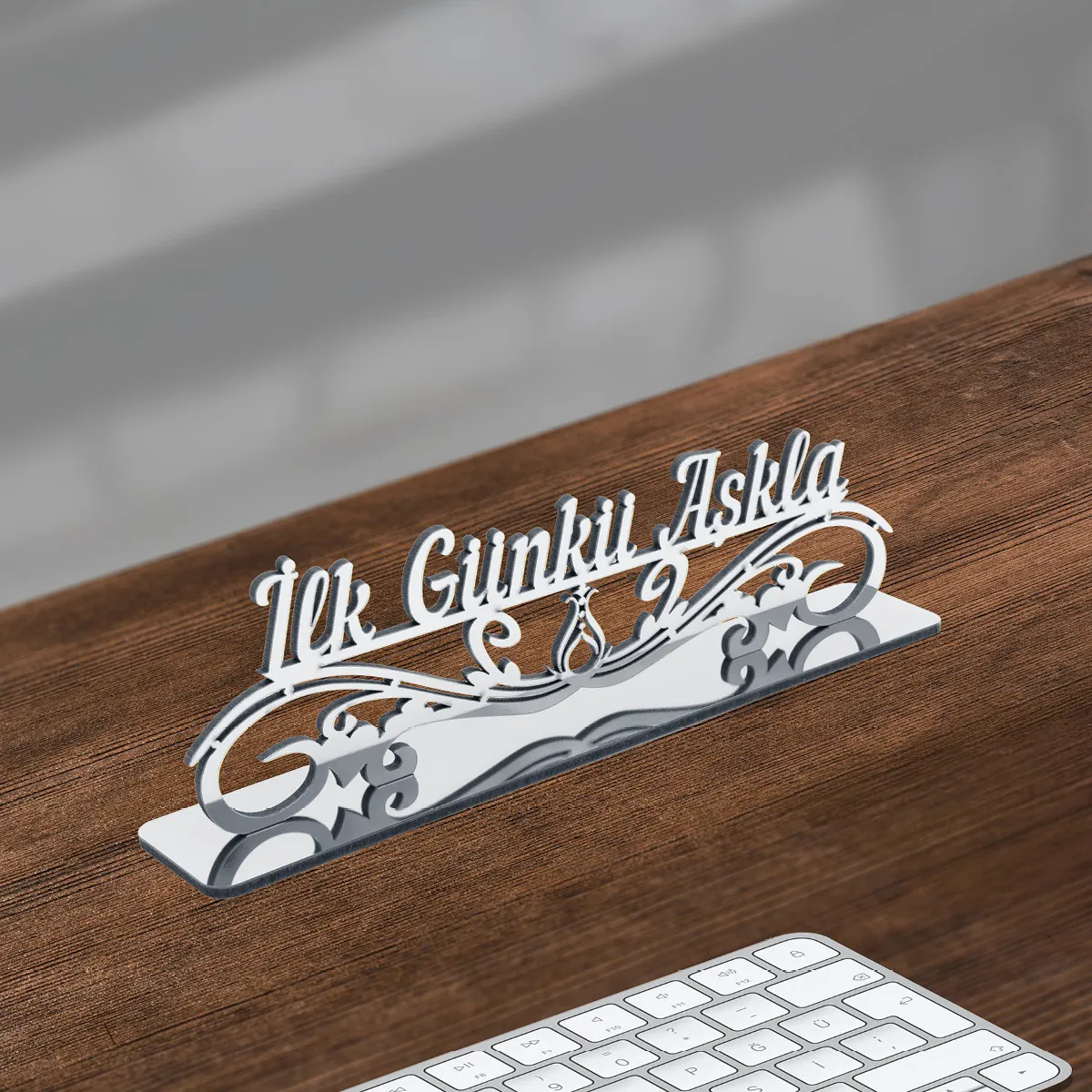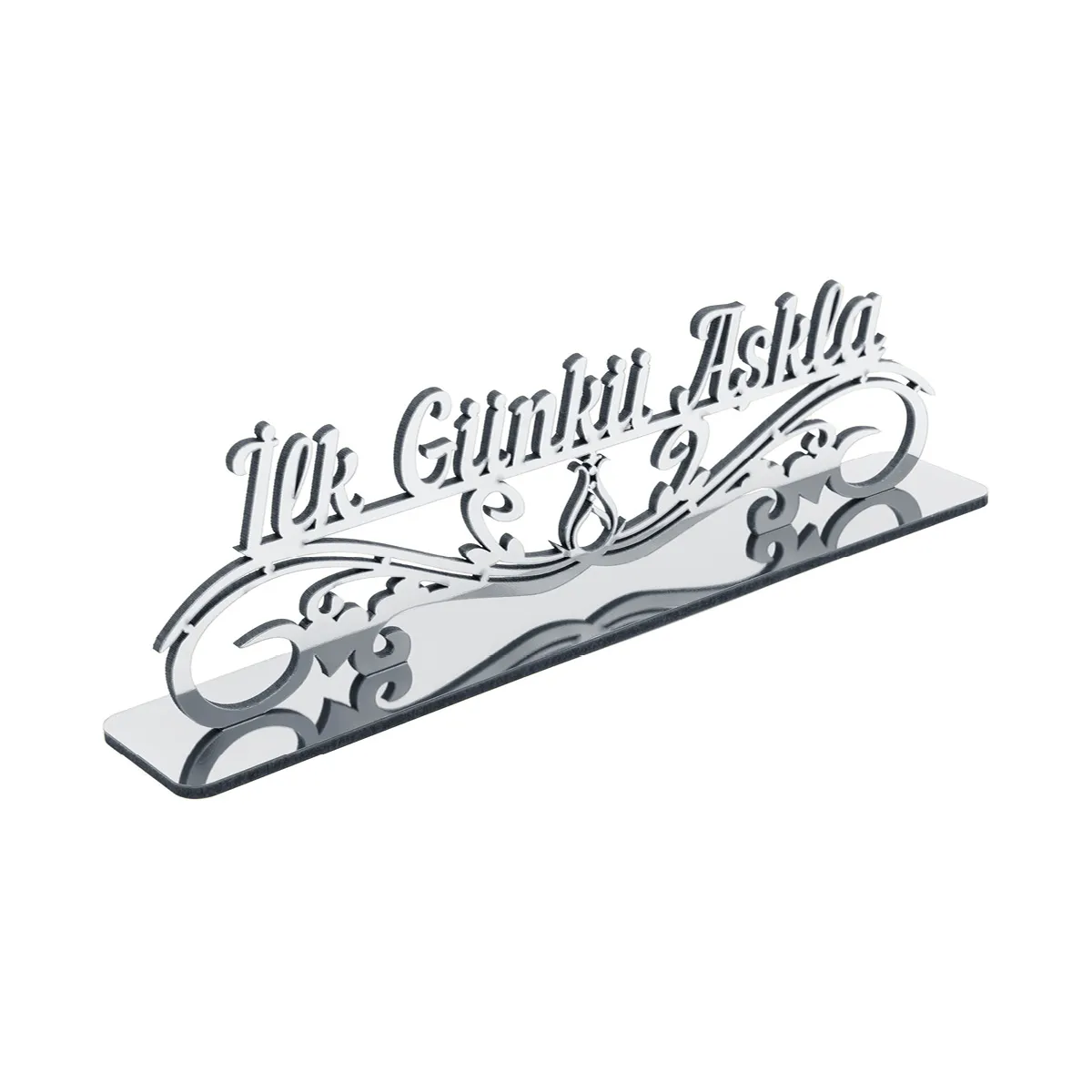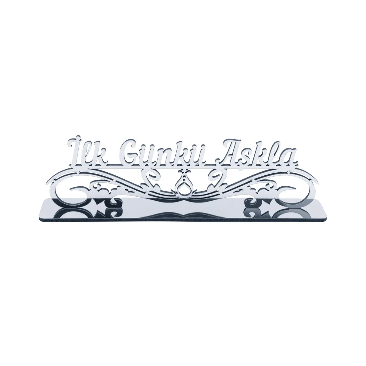 MDF destekli masaüstü dekor, pleksi üst yüzeyiyle hem ev hem ofis ortamına uygundur. Üzerinde “İlk Günkü Aşkla” yazısı ve Serhendi logosu bulunur. Gümüş ve altın renk seçenekleriyle sunulur. Pleksi üzerindeki koruyucu jelatin, kullanım öncesi çıkarılmalıdır.
