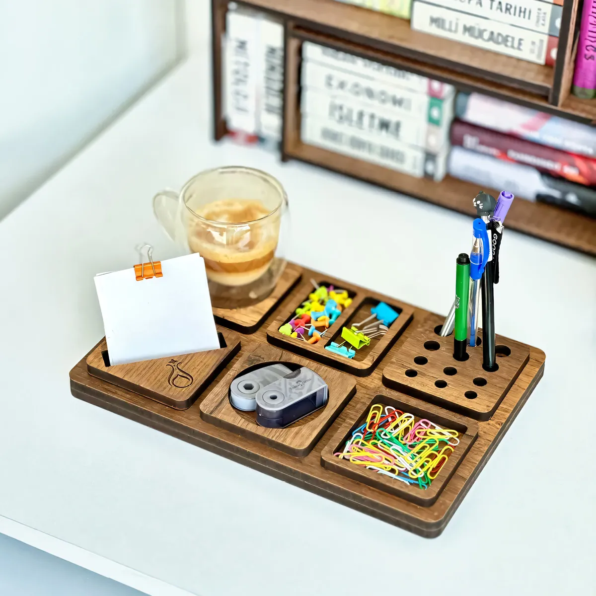 Masanızdaki dağınıklığa son veren Serhendi logolu ahşap masaüstü düzenleyici, şık tasarımı ve fonksiyonel yapısıyla çalışma alanınıza düzen ve estetik katar. Kalemlik, telefon standı ve dört farklı bölmesi sayesinde küçük eşyalarınızı kolayca organize etmenizi sağlar. Dayanıklı ve kaliteli malzemesiyle uzun ömürlü kullanım sunar.