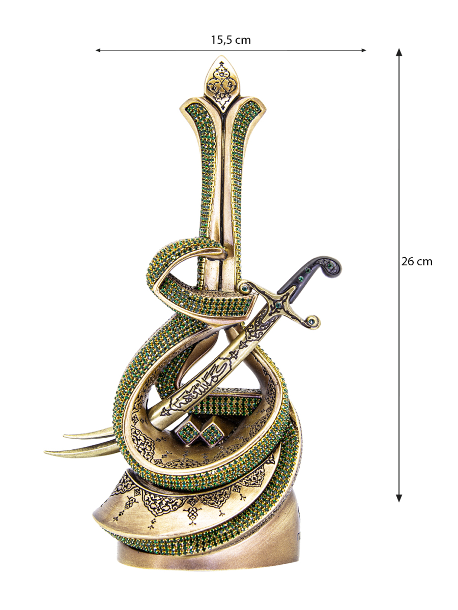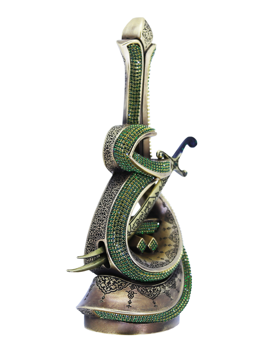 Zülfikar’ın siyah olan kabzasının tezyininde tane kristal taşlara yer verdik.