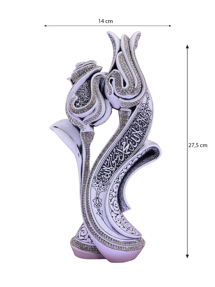(Peygamberimize salat ve selam olsun.) duasını nakşettik ve rumi desenler ile bezedik. Gülün tezyinatını da zincir kristal taşlarla sağladık.