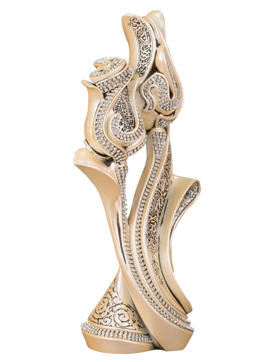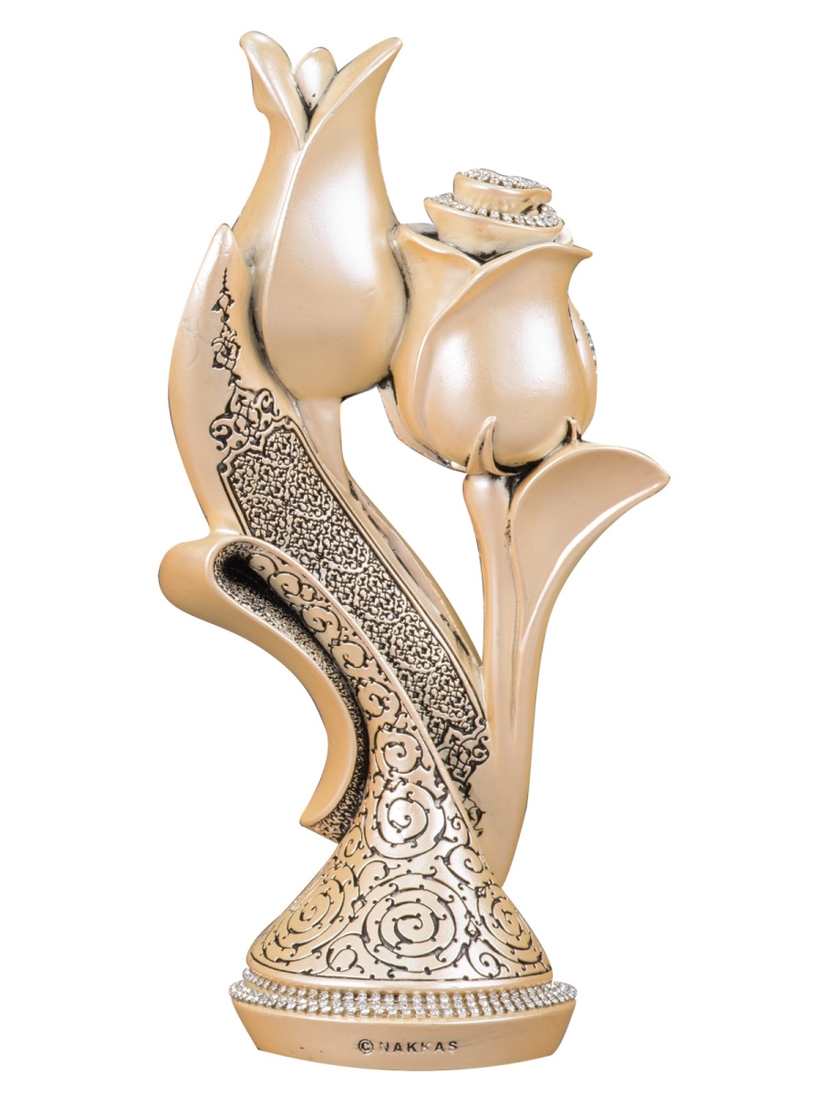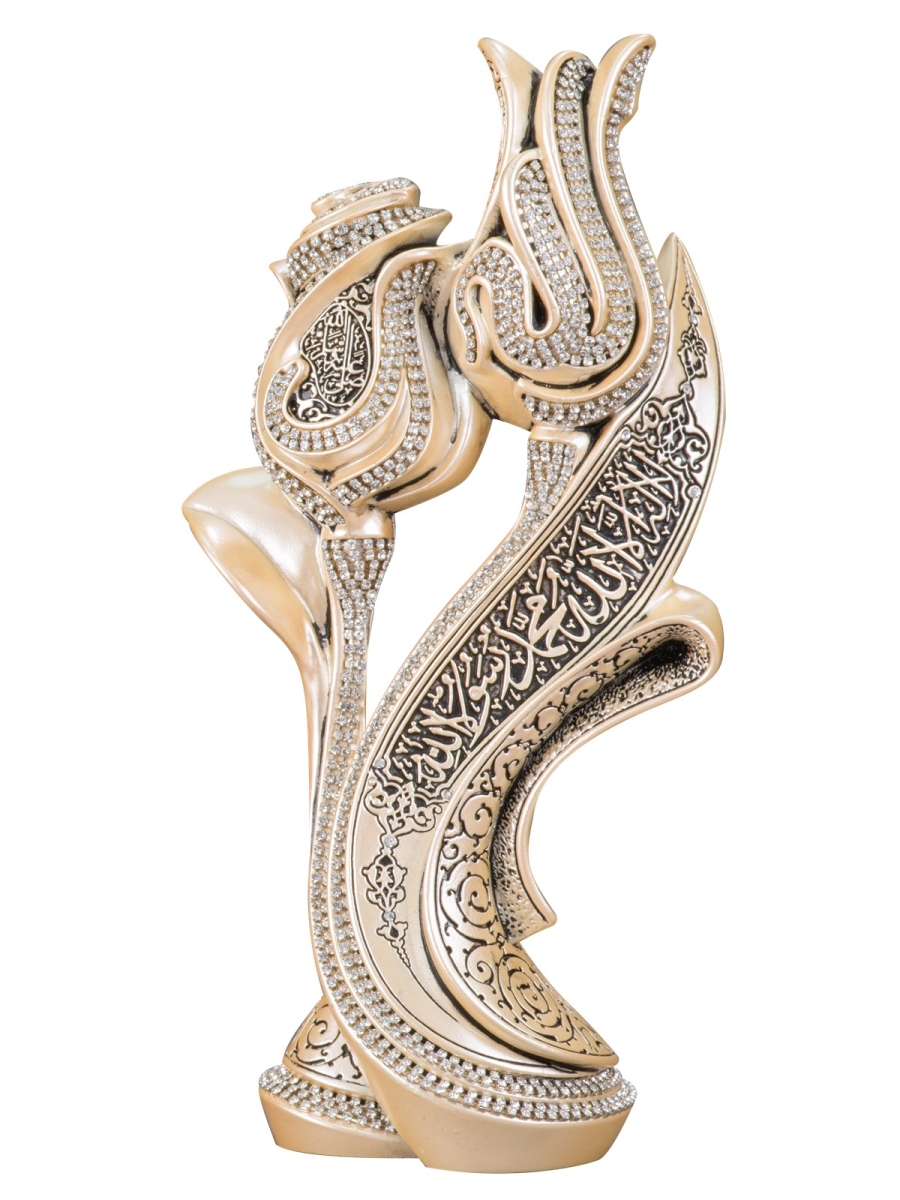(Peygamberimize salat ve selam olsun.) duasını nakşettik ve rumi desenler ile bezedik. Gülün tezyinatını da zincir kristal taşlarla sağladık.