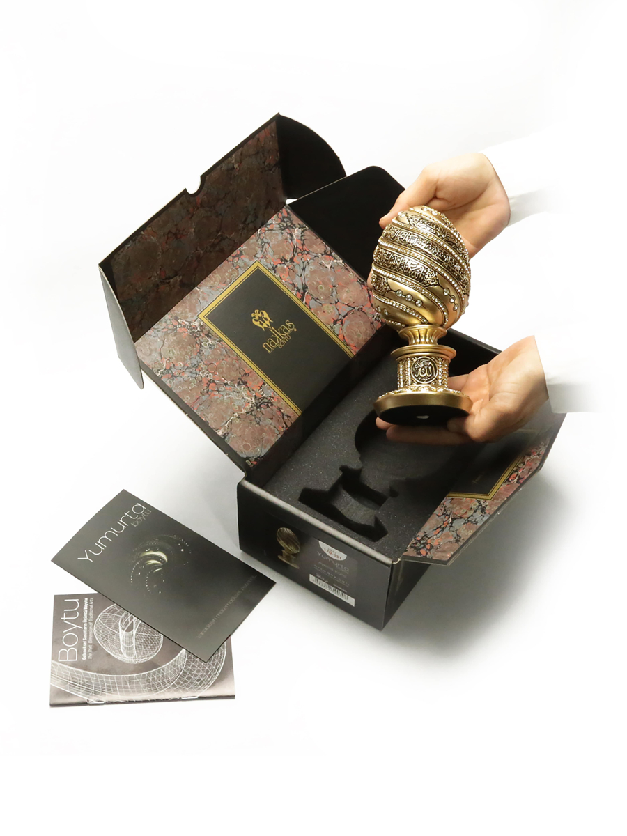 Stilize ederek kullandığımız yumurta formundan oluşturduğumuz gövdeye Ayet’el Kürsi’yi nakşettik.