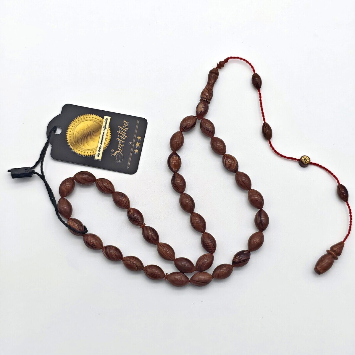 Tesbihlerde kullanılan materyal, ürün başlığında belirtilen cins bilgisine göre (sıkma kehribar, ateş kehribar vb.) değişmektedir. Kehribar yapısı gereği renk ve desenlerde doğal farklılıklar görülebilir.