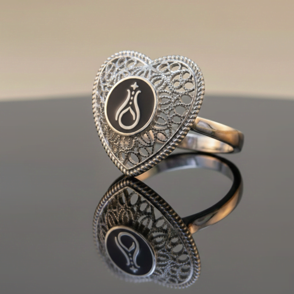 Telkari Kalp Gümüş Kadın Yüzük - Serhendi Logolu M1 Siyah
