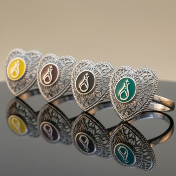 Telkari Koleksiyonu, Serhendi logosuyla süslenmiş 925 ayar kadın gümüş yüzükleriyle zarif ve geleneksel bir tasarım sunuyor. İnce telkari işçiliğiyle hazırlanan bu özel yüzükler, farklı tarz ve beğenilere hitap edecek şekilde çeşitli renk ve modellerde üretilmektedir.