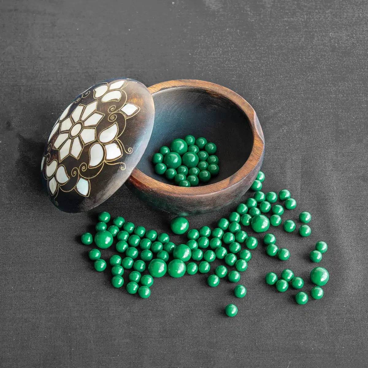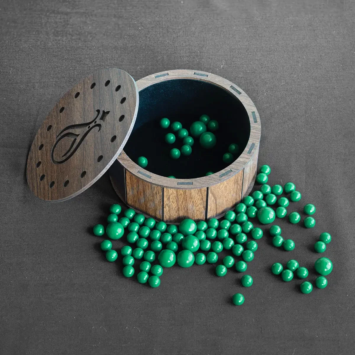 Yeşil renkte epoksi boyalı hatme taşları, 10 mm taşlardan 102 adet ve 15 mm taşlardan 10 adet olmak üzere toplam 112 taş içerir.